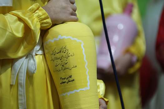 وارد سالن که میشویم، دخترانی با لباس مدرسه روی صندلیها نشستهاند. پرچم ایران در دستهایشان میدرخشد و بادکنکی که کنار صندلی جا خوش کرده است.